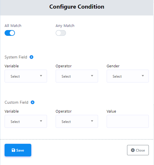 - ضمن إعدادات مكون الشرط، يُمكن للمستخدمين اختيار استخدام زري اختيار: "تطابق الكل" و"أي تطابق". يُحدد هذان الخياران ما إذا كان يجب استيفاء جميع الشروط المُحددة في آنٍ واحد، أو ما إذا كان أيٌّ منها كافيًا لبدء إجراء أو استجابة مُحددة.