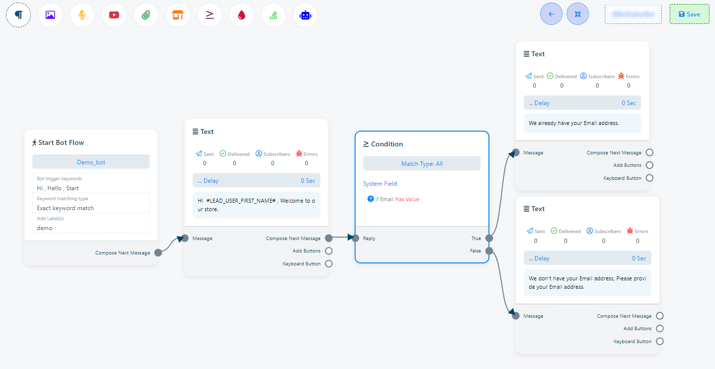 - إذا كانت قيمة الشرط خاطئة، يمكنك ربط رسالة تدفق إدخال المستخدم بعنصر النص المتصل بمقبس "خطأ". ستطلب رسالة تدفق إدخال المستخدم هذه من المستخدم تقديم عنوان بريده الإلكتروني، والذي يمكن حفظه في النظام أو في متغير حقل مخصص حسب الحاجة.