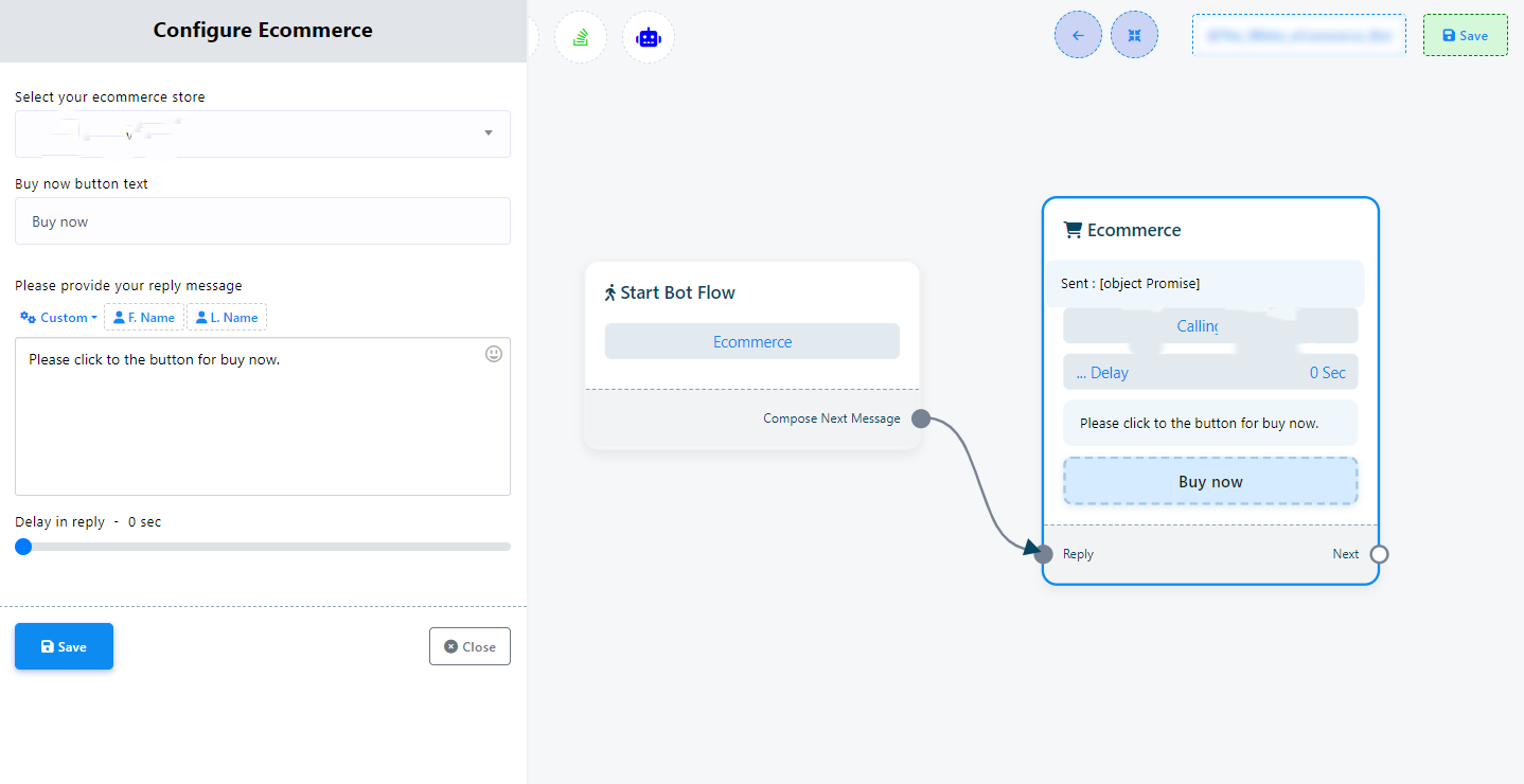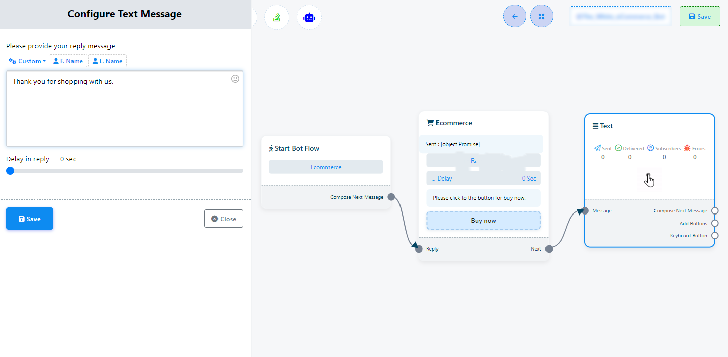 في الختام، يمكنك تقديم رسالة أخيرة لإكمال التفاعل. للقيام بذلك، اسحب مؤشر الماوس من نافذة "التالي" في مُكوّن التجارة الإلكترونية، ثم حدد مُكوّن النص. ثم أدخل رسالتك النهائية.