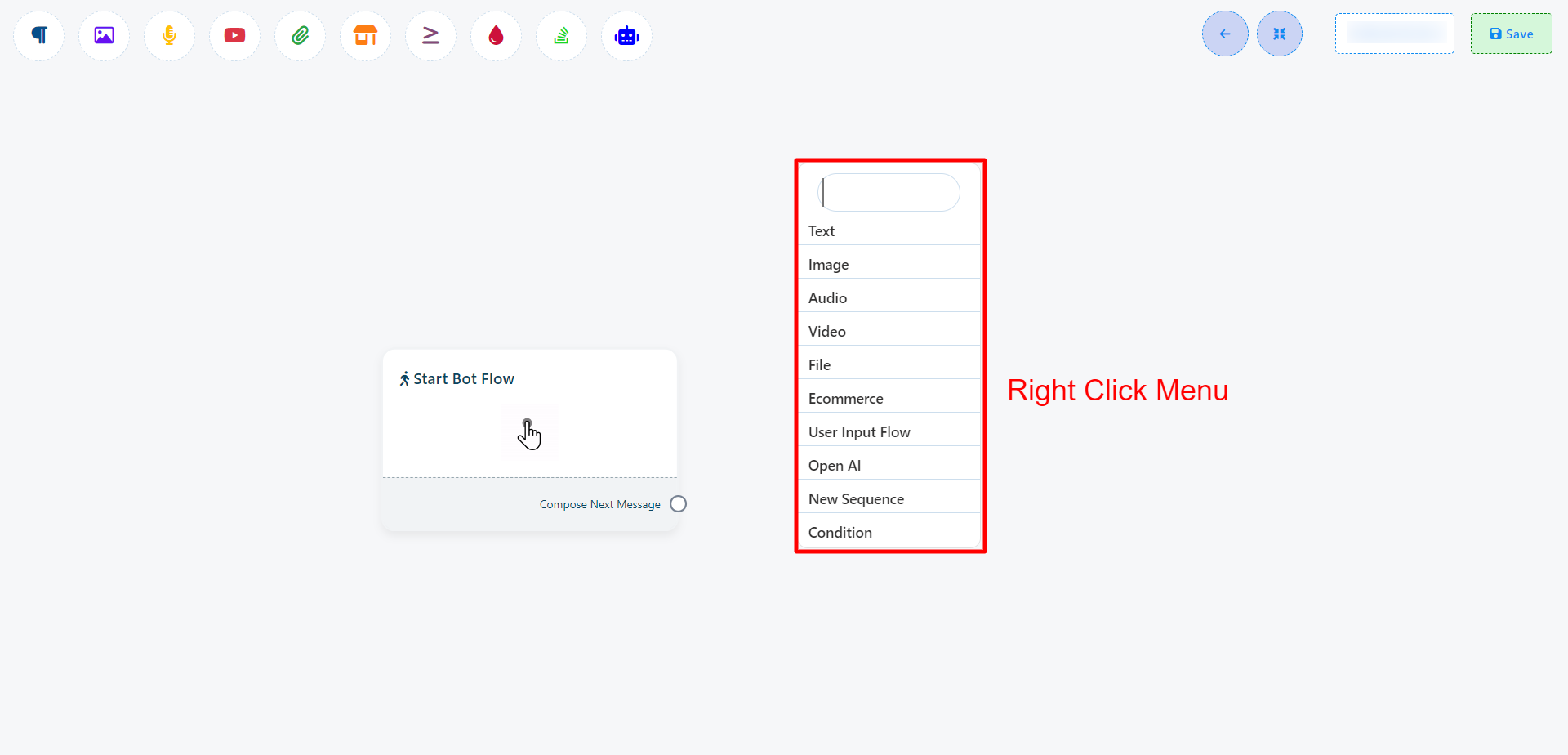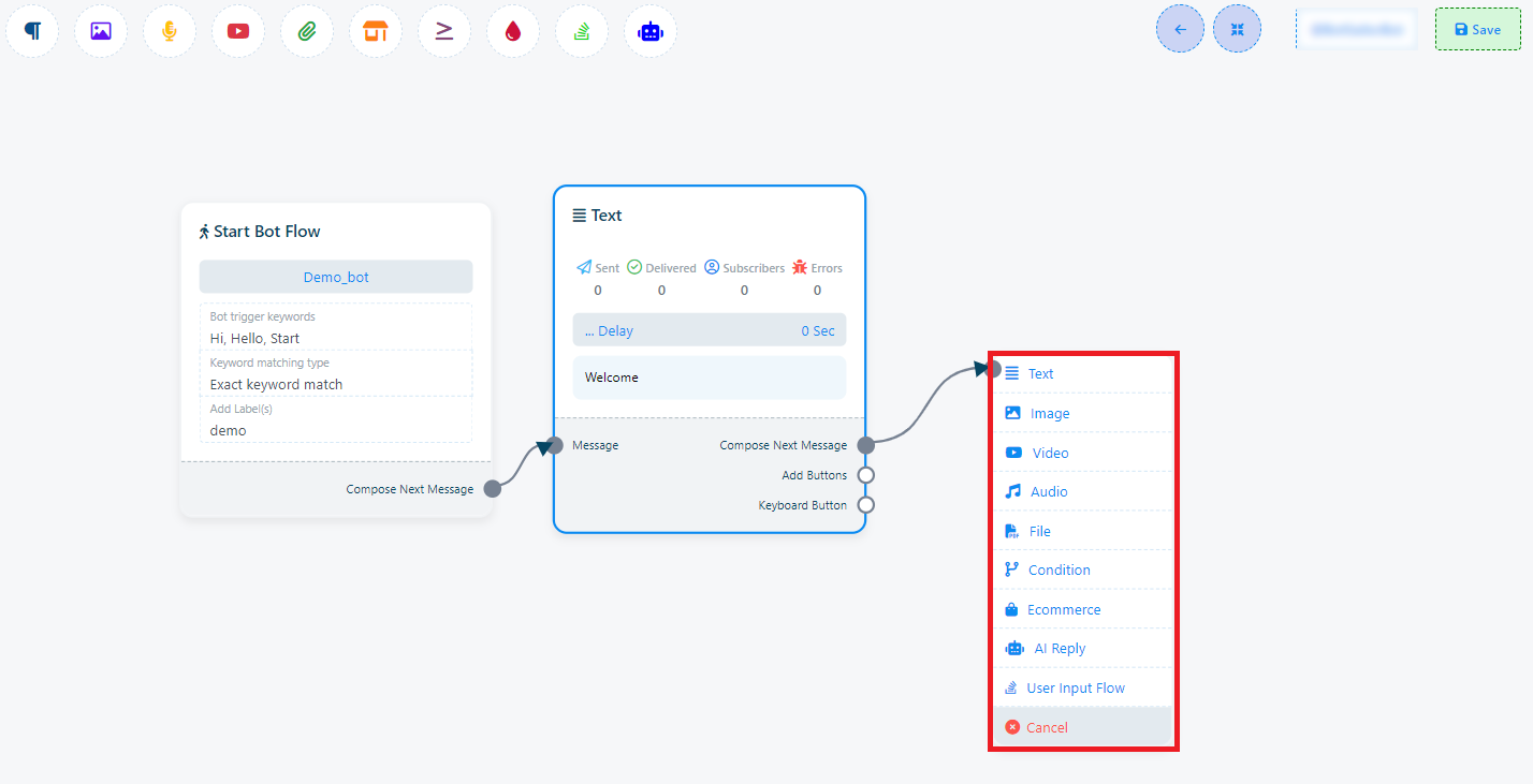 بعد إكمال إعداد "بدء تدفق البوت"، سترى منفذًا يُسمى "إنشاء الرسالة التالية". يتيح لك هذا المنفذ إضافة مكونات رد متنوعة. بعد إضافة المكونات، يجب عليك تكوينها وفقًا لذلك.