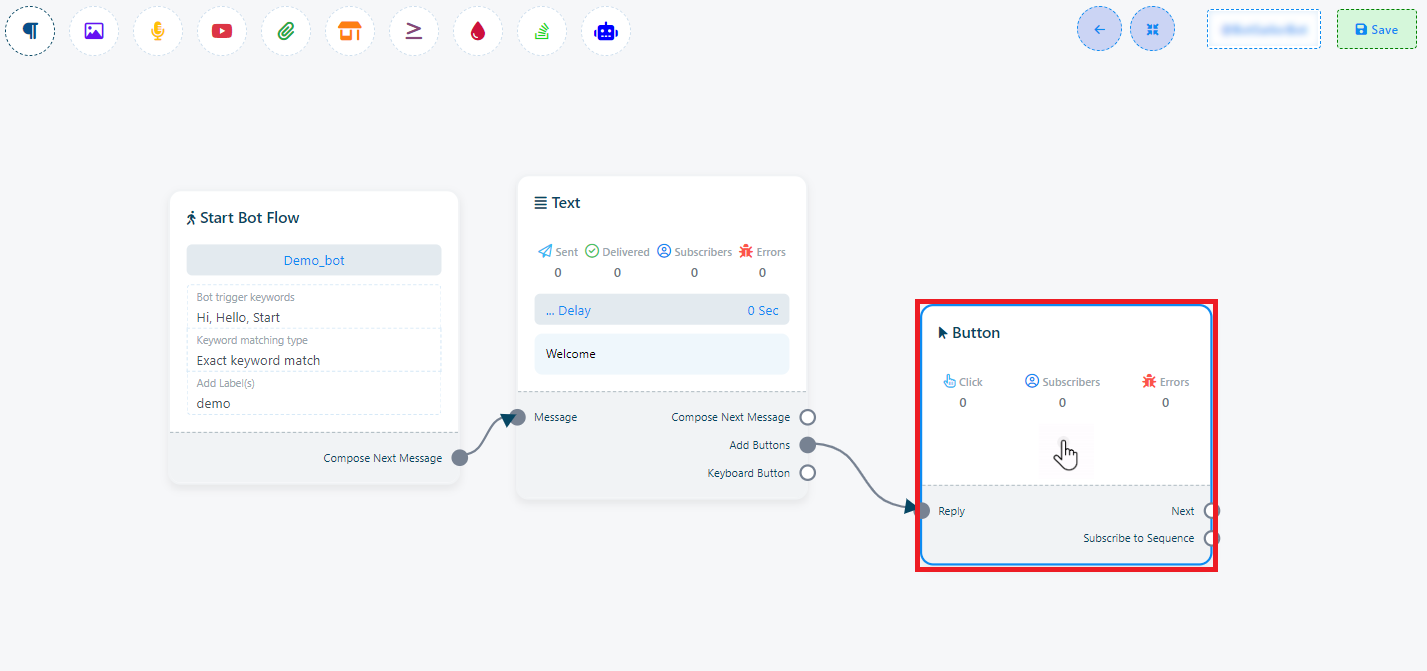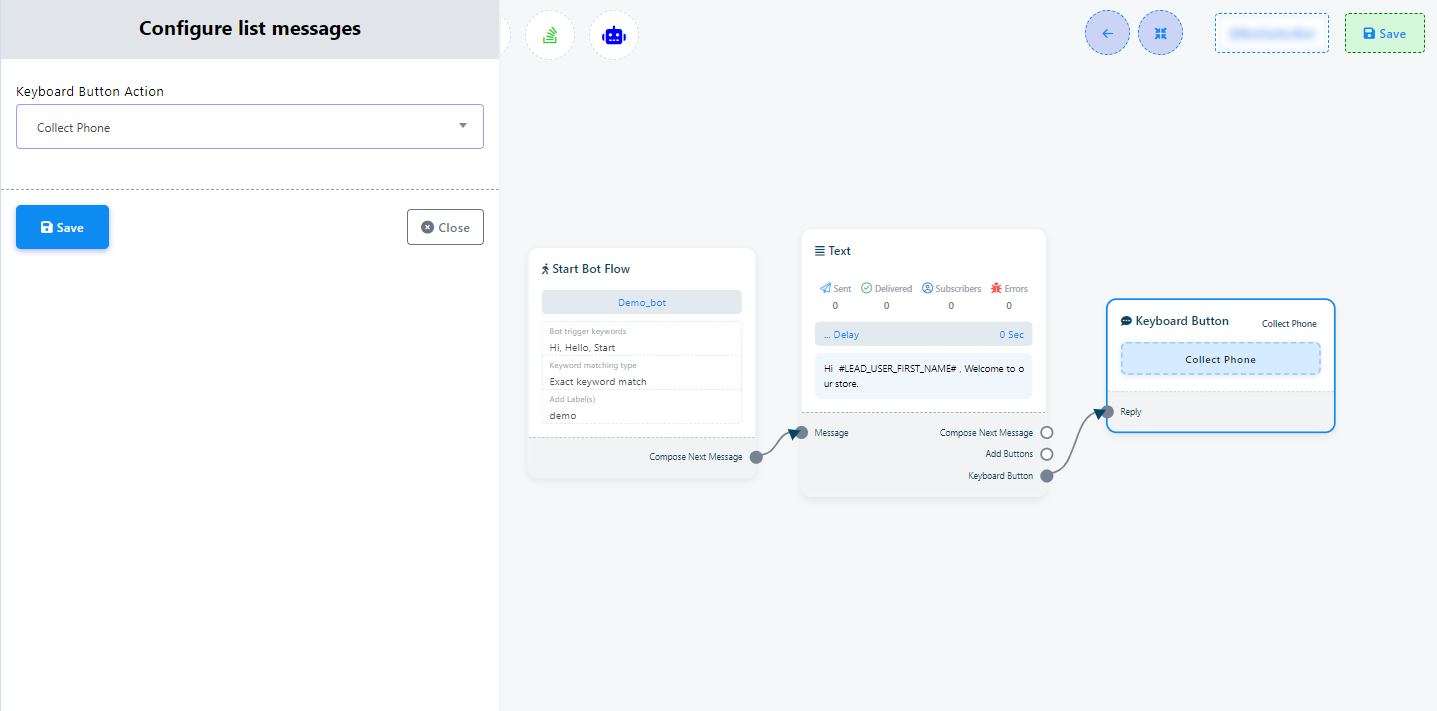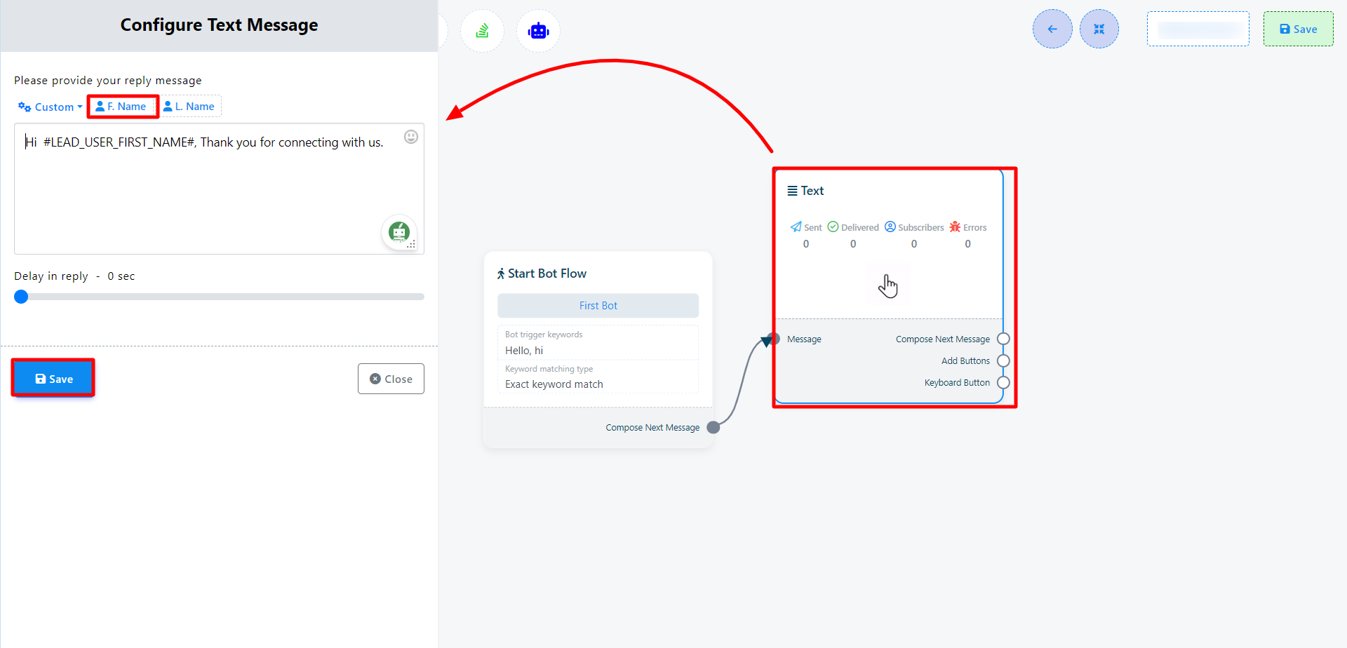 الآن انقر على زر "حفظ" وستظهر المعلومات على المكوّن. ثم وصّل مكوّن النص بمكوّن بدء تدفق بوت.