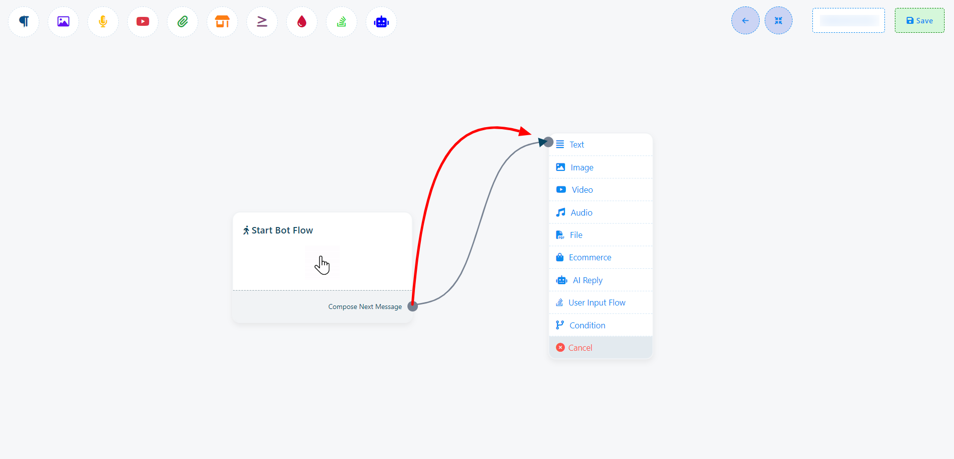 على سبيل المثال، لنفترض أنك سحبت من منفذ الإخراج التالي لمكون النص. سيؤدي ذلك إلى ظهور قائمة منسدلة تعرض مكونات مختلفة، مثل النص، والصورة، والفيديو، والصوت، والملف، والتجارة الإلكترونية، وتدفق إدخال المستخدم، وزر "إلغاء". من هذه القائمة المنسدلة، يمكنك اختيار المكون المطلوب. إذا كنت ترغب في الإلغاء وعدم إضافة مكون، فما عليك سوى النقر على زر "إلغاء".