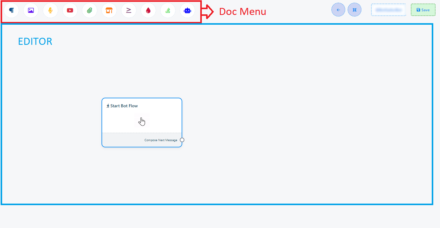 بمجرد فتح مُنشئ التدفق، ستجد جميع المكونات مُجمّعة بشكل مُلائم في الزاوية العلوية اليسرى من الشاشة ضمن "القائمة العلوية". في الوقت نفسه، ضمن قسم "المحرر"، ستلاحظ أن مُكوّن "بدء تدفق بوت" مُحمّل مُسبقًا لتسهيل الاستخدام.