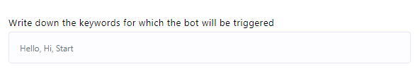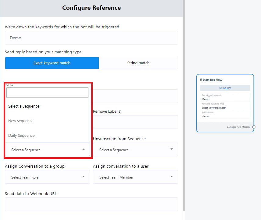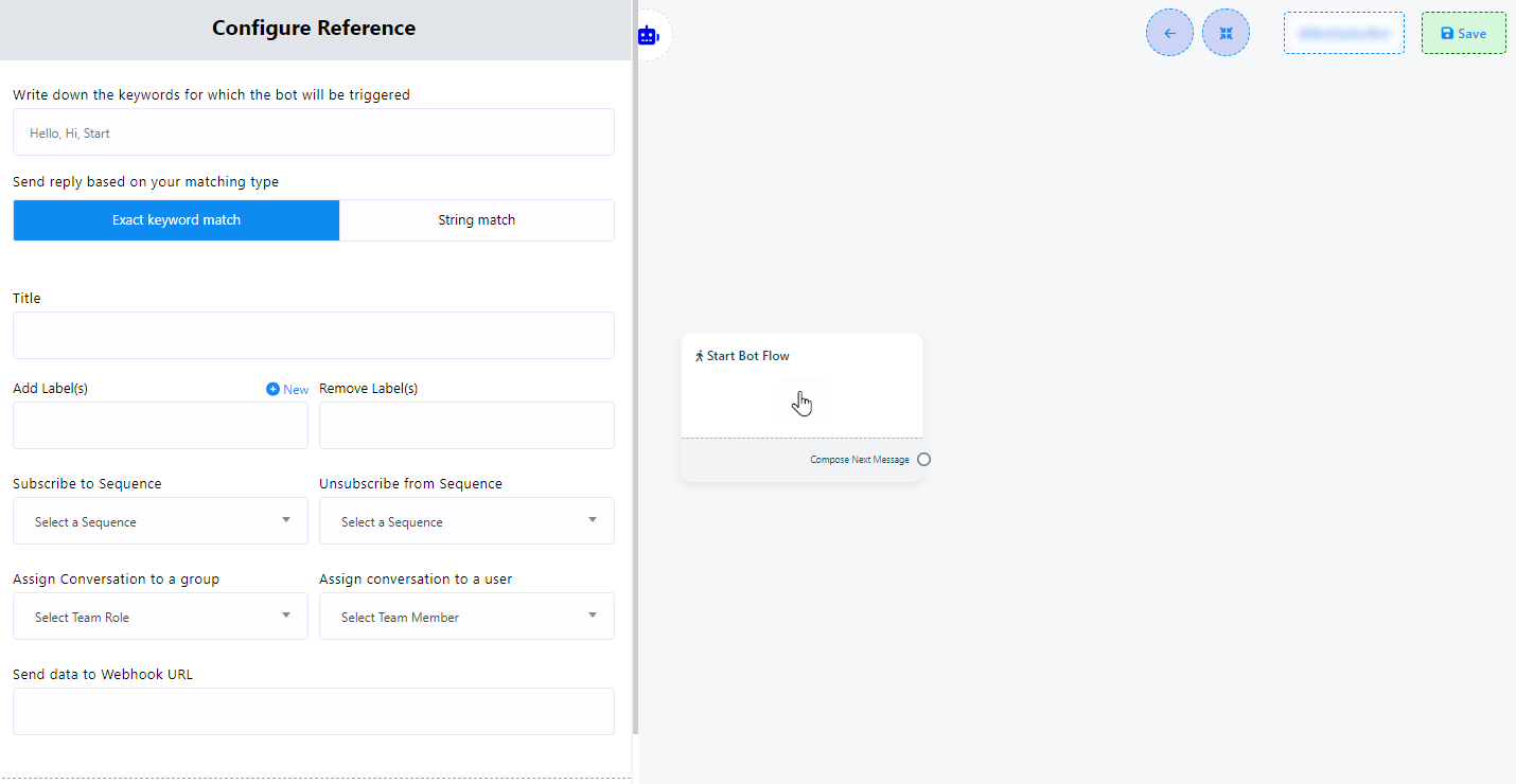 - تشغيل الكلمات المفتاحية: لبدء تشغيل البوت باستخدام كلمات مفتاحية محددة، انقر نقرًا مزدوجًا على عنصر "بدء تدفق البوت". سيؤدي هذا الإجراء إلى فتح الشريط الجانبي الأيسر "تكوين المرجع"، والذي يضم عشرة حقول وزرين. في حقل الكلمات المفتاحية، أضف الكلمات المفتاحية وافصلها بفاصلة عند إضافة أكثر من كلمة مفتاحية. عند إدخال المستخدم نصًا في نافذة الرسائل يطابق أيًا من هذه الكلمات المفتاحية، سيتم تنشيط البوت.