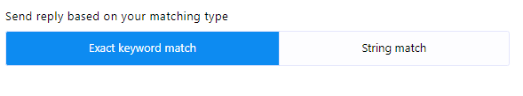 - نوع المطابقة: يمكنك اختيار نوع المطابقة بالنقر على أحد الزرين المُتاحين: "مطابقة لوحة المفاتيح تمامًا" أو "مطابقة السلسلة النصية". يكون خيار "مطابقة لوحة المفاتيح تمامًا" مُحددًا افتراضيًا. باستخدام هذا الخيار، سيبدأ البوت بالعمل فقط إذا تطابقت مدخلات المستخدم تمامًا مع الكلمة المفتاحية. أما مع "مطابقة السلسلة النصية"، فسيبدأ البوت بالعمل إذا تطابقت مدخلات المستخدم جزئيًا مع الكلمة المفتاحية.