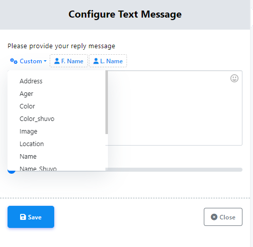 إدخال الرسالة: في حقل النص، يمكنك إدخال رسالة الرد. هنا، يمكنك أيضًا تضمين عناصر ديناميكية، مثل اسم المستخدم الأول واسم عائلته، أو متغيرات الحقول المخصصة، في رسالة الرد لتخصيص التفاعل.