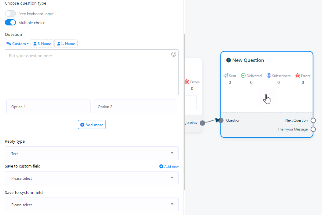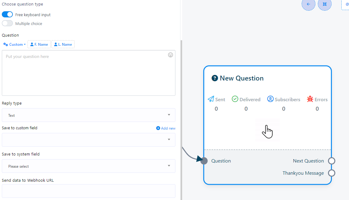 - انقر نقرًا مزدوجًا على مكون "سؤال جديد" للوصول إلى زرين: "إدخال لوحة المفاتيح الحر" و"اختيار من متعدد". يحدد هذان الزران نوع الأسئلة التي ترغب في طرحها.