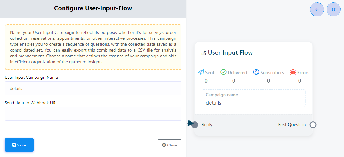 تدفق مدخلات المستخدم ميزة فعّالة تُسهّل جمع البيانات من المستخدمين عبر تفاعلات حوارية طبيعية. باستخدام هذه الميزة، يُمكنك إنشاء تدفقات تفاعلية لطرح الأسئلة على المستخدمين وتخزين إجاباتهم في حقول مُخصصة. يُمكن بعد ذلك الاستفادة من هذه البيانات المُجمعة لتخصيص تجارب المستخدم، أو تقسيم المشتركين، أو تصدير المعلومات إلى ملف CSV.