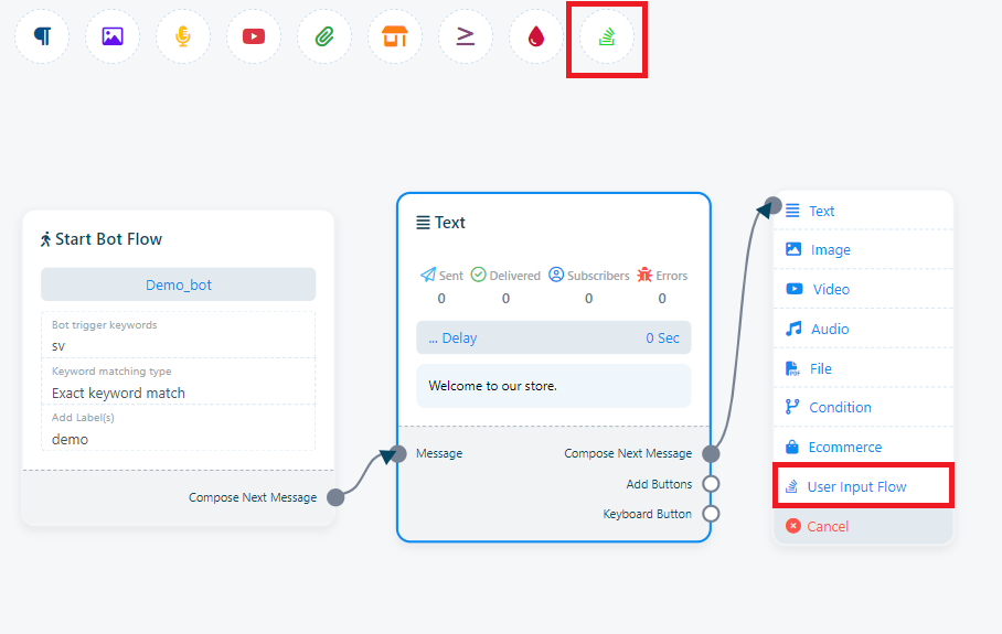 بمجرد تفعيل حملة "تدفق مدخلات المستخدم"، يمكنك دمجها بسلاسة في تدفق بوتك. عندما يصادف المستخدم مكون "تدفق مدخلات المستخدم" في تدفق بوتك، سيُطلب منه طرح الأسئلة المحددة في حملتك. سيتم تسجيل إجاباته تلقائيًا في الحقول المخصصة.