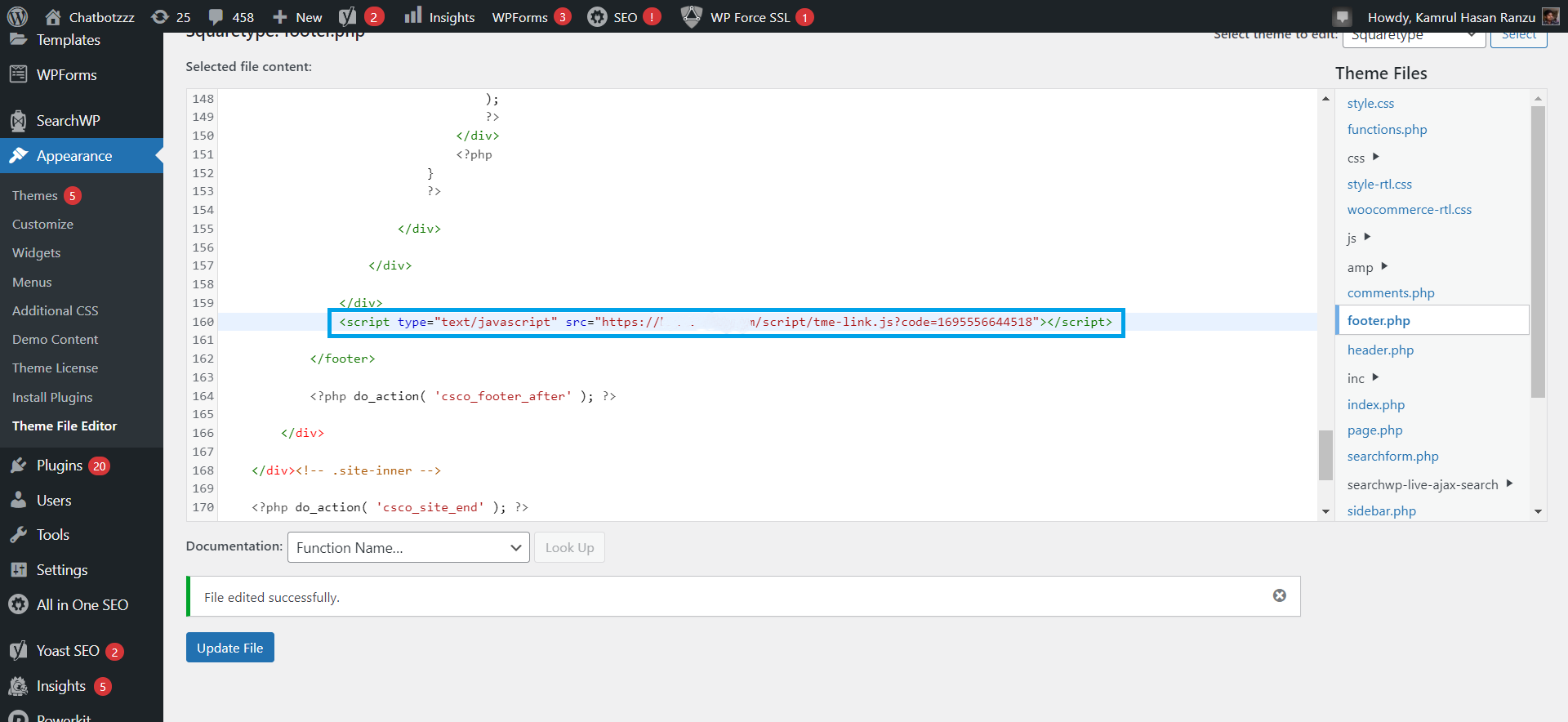4. قم بلصق الكود المنسوخ في قسم التذييل.