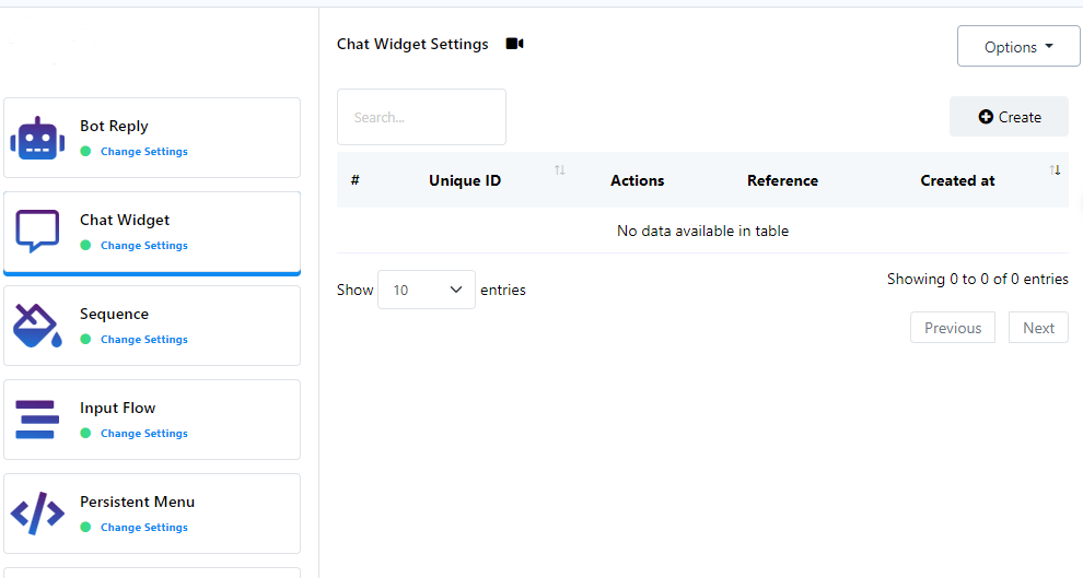 2. داخل Telegram Bot Manager، حدد قسم `Chat Widget` وانقر على زر `إنشاء`.