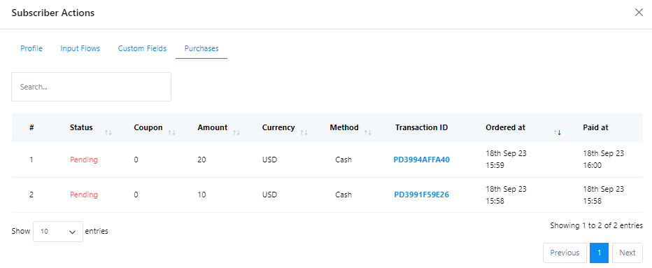 سجل المشتريات: انقر فوق المشتريات للتحقق من كل عملية شراء قام بها المشترك.