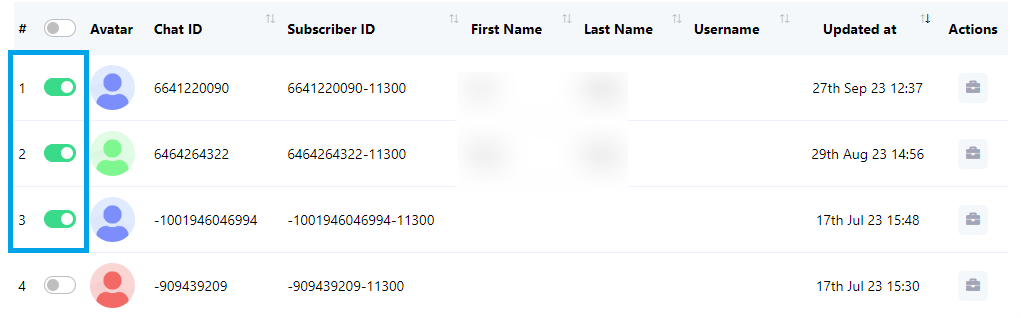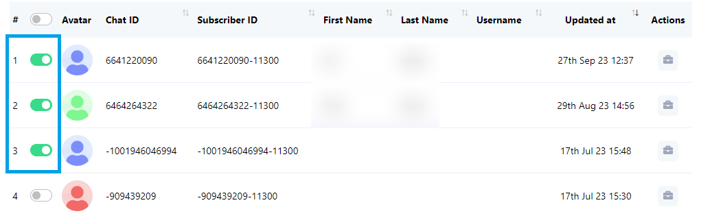 - في قائمة المشتركين، بدّل المشتركين الذين ترغب بحذفهم. يمكنك تبديل مشترك واحد أو عدة مشتركين حسب تفضيلاتك.