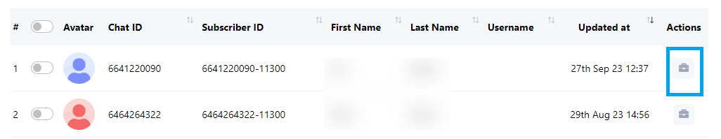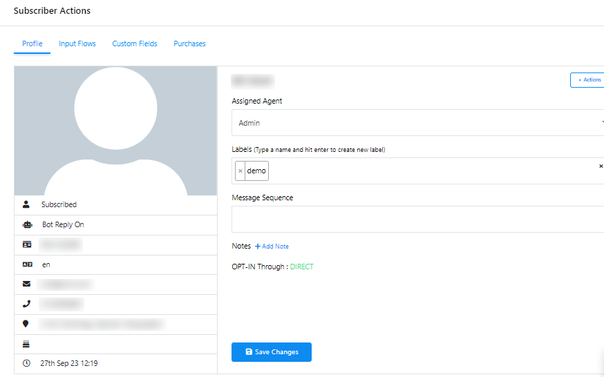 - في النافذة المنبثقة، يمكنك تنفيذ إجراءات مختلفة، بما في ذلك إلغاء اشتراك المشترك، أو إيقاف ردود الروبوت مؤقتًا أو استئنافها، أو إعادة تعيين تدفق إدخال المستخدم، أو مزامنة بيانات المشترك.