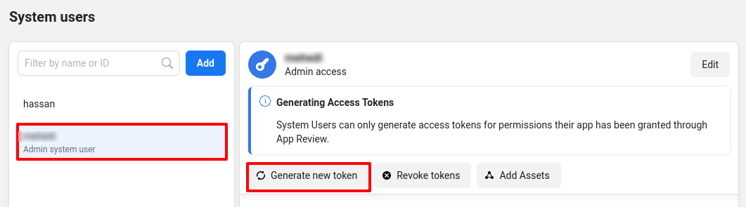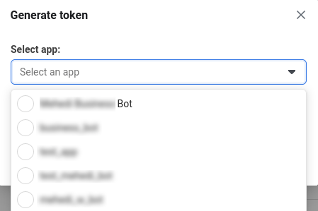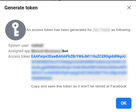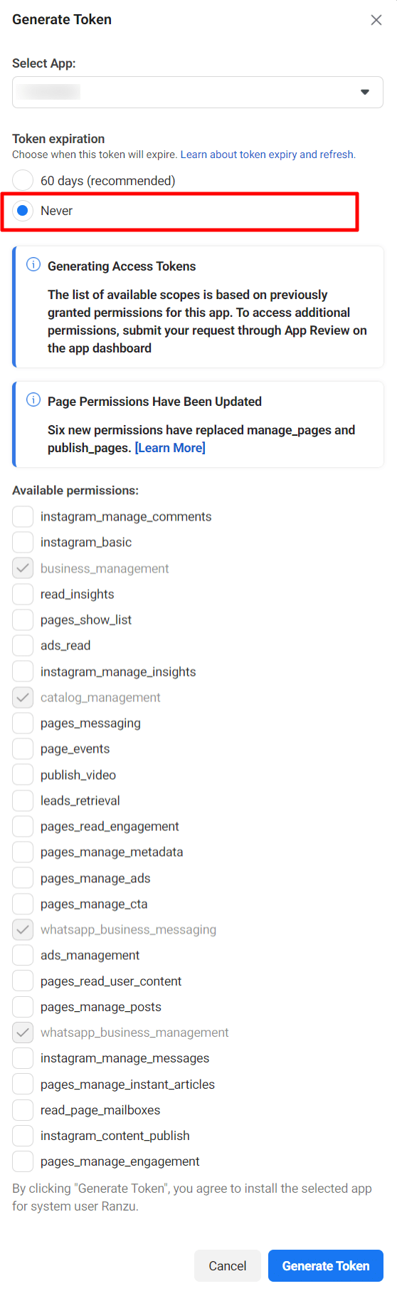 ستظهر قائمة بالأذونات المتاحة. من القائمة، اختر إدارة الأعمال، إدارة الكتالوج، مراسلة واتساب للأعمال، وإدارة واتساب للأعمال. انقر الآن على زر "إنشاء رمز مميز".
