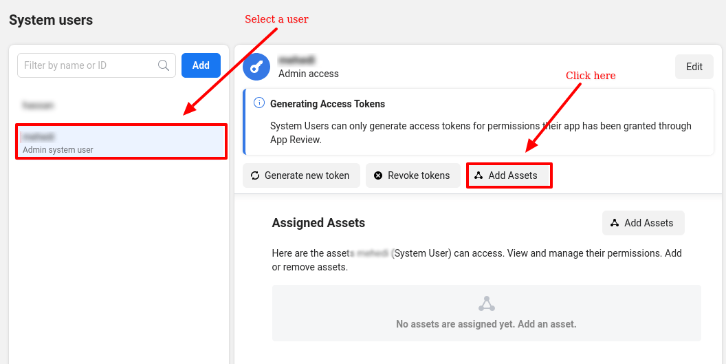 الآن عليك إضافة أصول لمستخدم. لإضافة أصول، حدد مستخدمًا وانقر على زر "إضافة أصول".