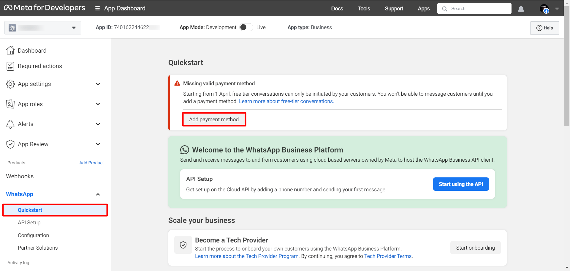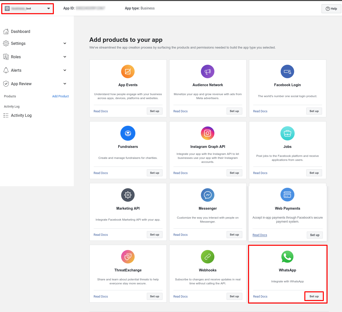 نظرًا لأنك ستقوم بإنشاء تطبيق لحساب WhatsApp التجاري، فيجب عليك إضافة WhatsApp إلى التطبيق.