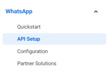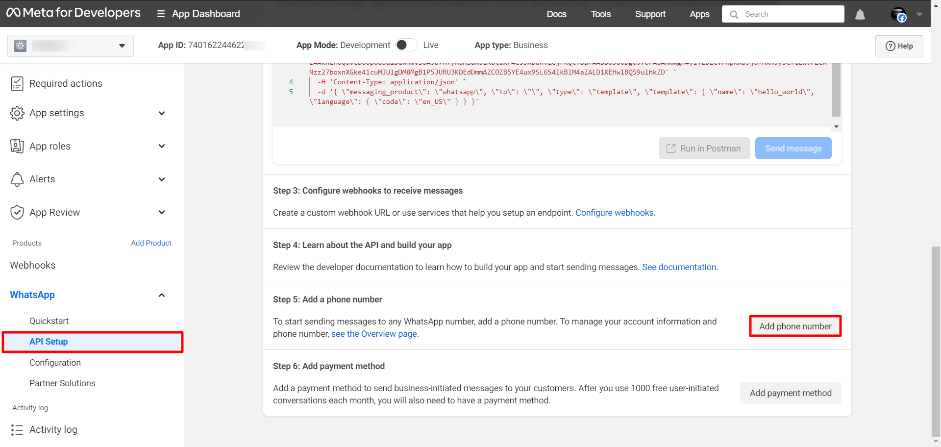 ثم انتقل إلى إعداد API من القائمة اليسرى وانقر على زر "إضافة رقم الهاتف" لإضافة رقم الهاتف إلى WhatsApp Cloud API.