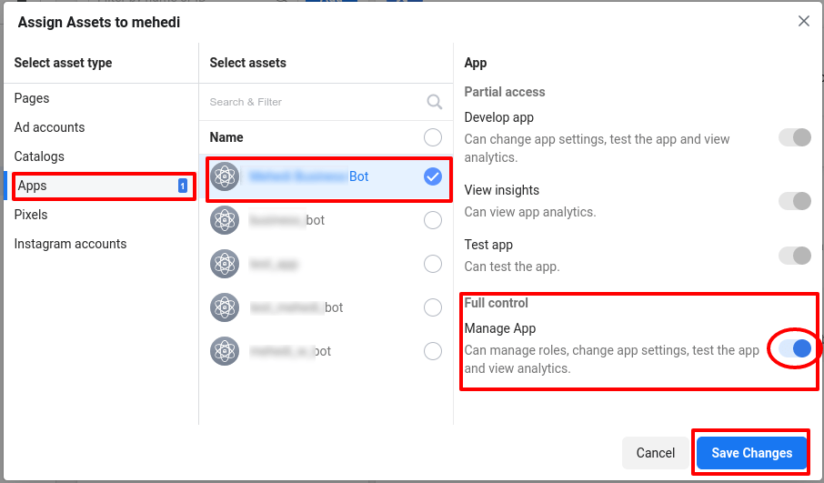 ستظهر نافذة منبثقة على الفور. من قسم "تحديد نوع الأصول" في النافذة المنبثقة، اختر قائمة "التطبيقات". الآن، حدد التطبيق الذي تريد تعيين الأصول له. ثم امنح الإذن. هنا، أمنح "التحكم الكامل" بتفعيل زر الراديو الخاص بخيار "التحكم الكامل". الآن، انقر على زر "حفظ التغييرات".