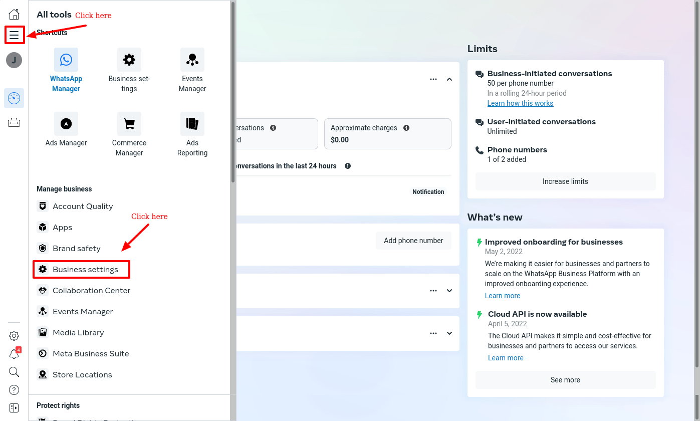 لإنشاء بوت واتساب، عليك أولاً ربط البوت بـ Chatii AI. ولربطه، عليك إنشاء واجهة برمجة تطبيقات واتساب السحابية.