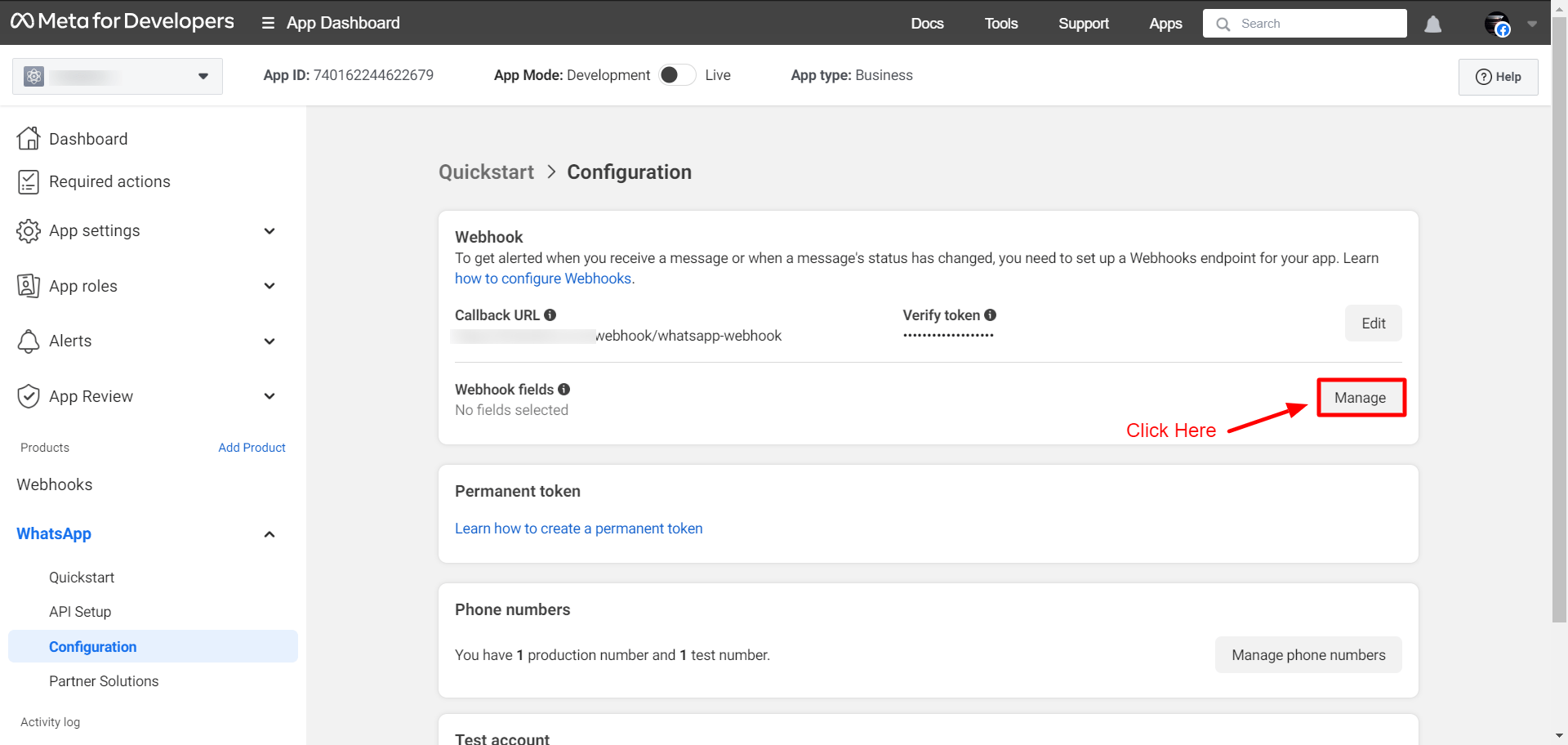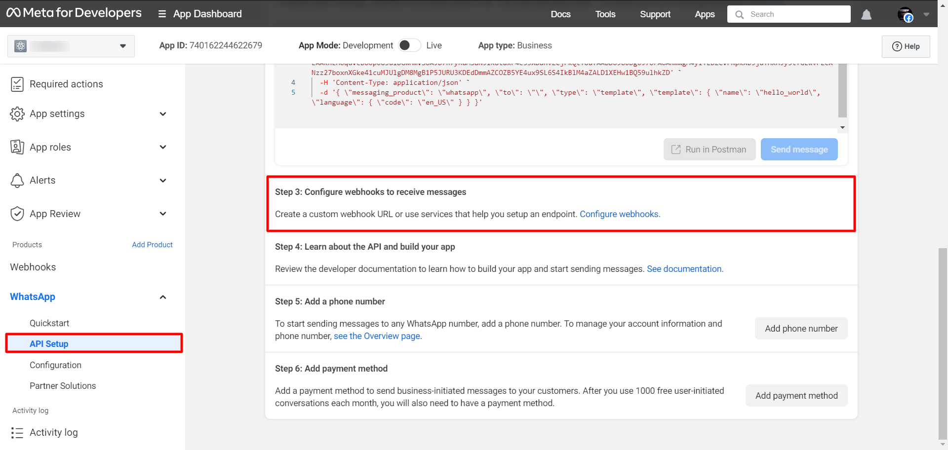 الآن، عليك تهيئة خطاف الويب لاستقبال الرسائل. لتكوين خطافات الويب، انتقل إلى الخطوة 3 من إعدادات واجهة برمجة التطبيقات وانقر على رابط "تهيئة خطافات الويب".