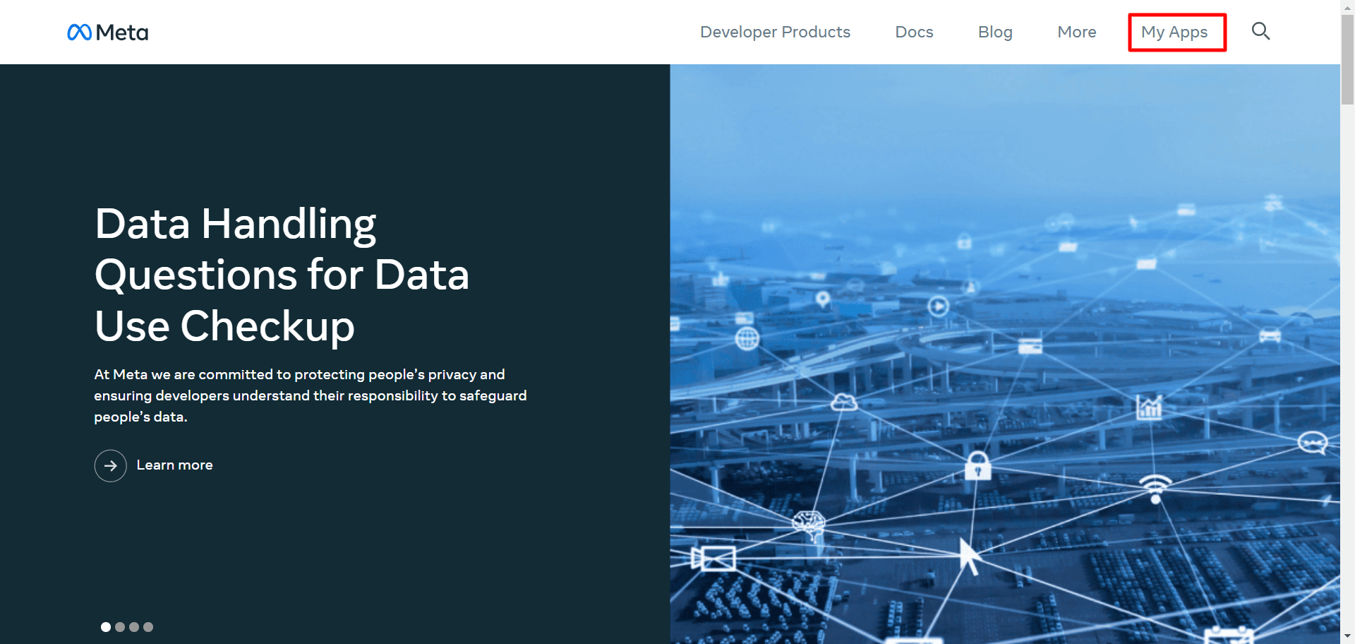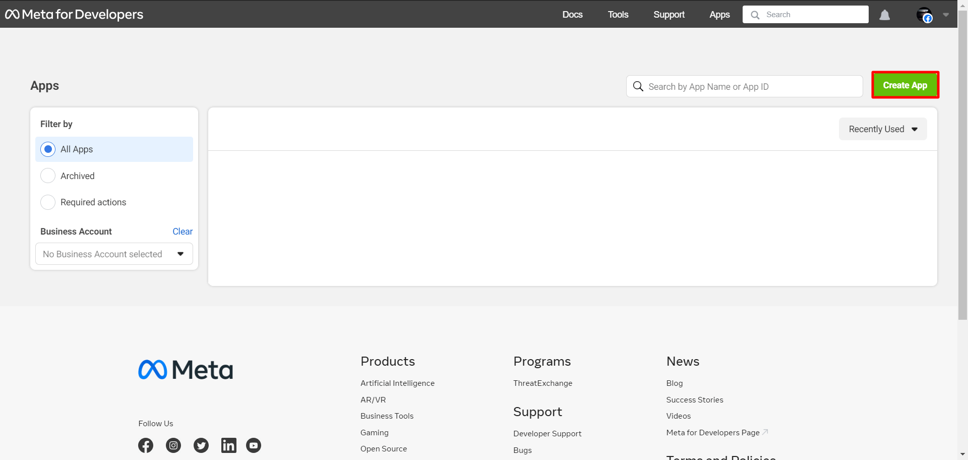 لإنشاء تطبيق، انتقل إلىhttps://developers.facebook.com/. وانقر على تبويب "تطبيقاتي" في الصفحة.