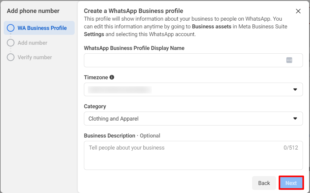 في اسم العرض الخاص بملف واتساب للأعمال، أدخل اسم العرض. ثم في حقل "المنطقة الزمنية"، حدد المنطقة الزمنية. ثم حدد فئة عملك في حقل "الفئة". انقر على حقل "الفئة" وستظهر قائمة منسدلة بالفئات المختلفة. ومن القائمة، حدد فئة.