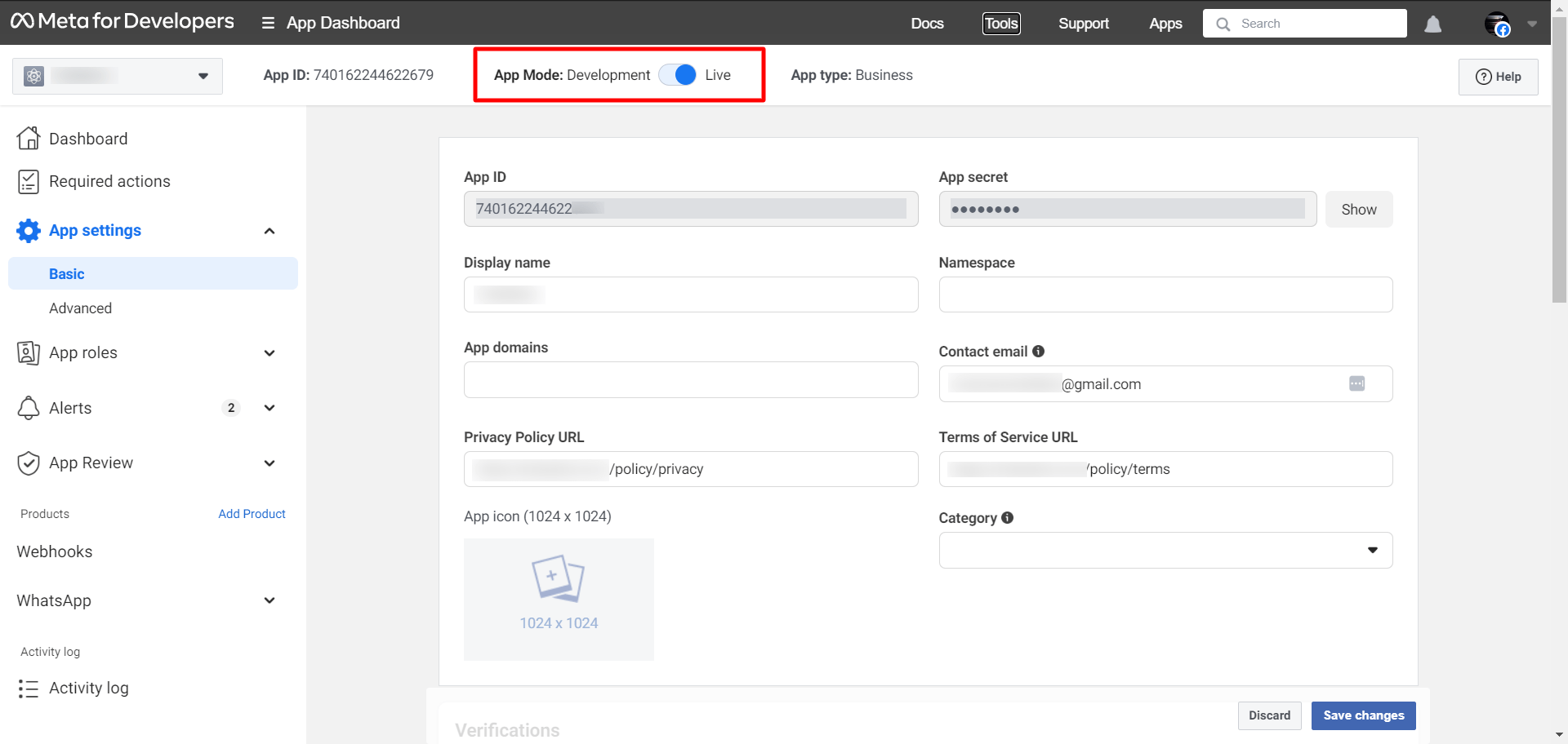 بعد إضافة روابط الخصوصية والشروط والأحكام، فعّل الوضع المباشر من وضع المطور. للقيام بذلك، انقر على زر التبديل كما هو موضح أدناه.