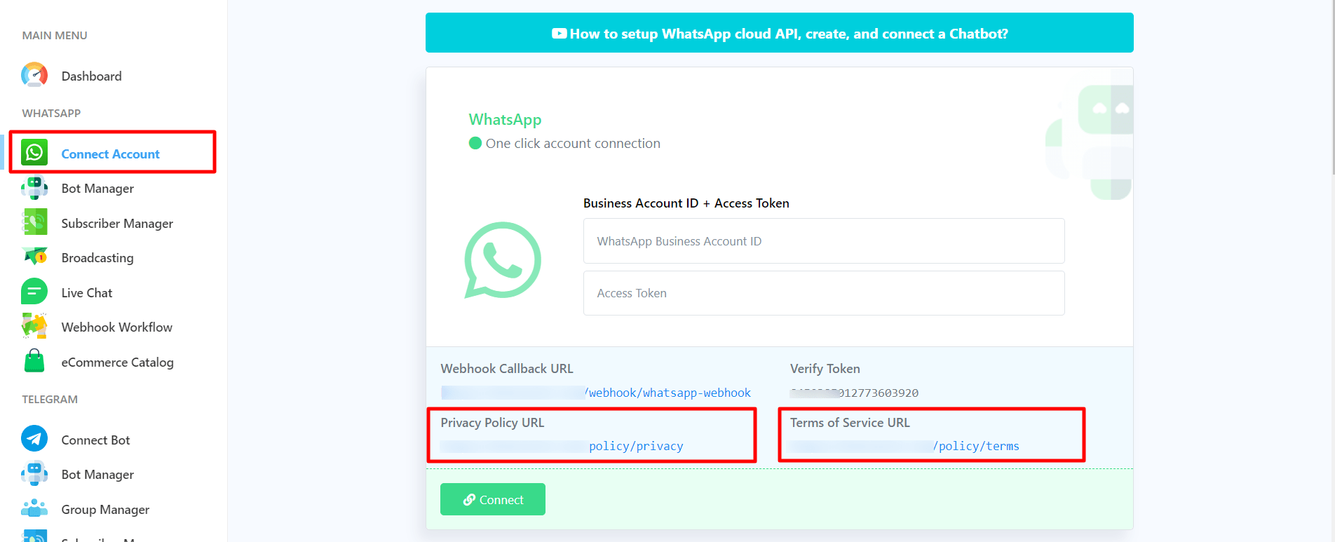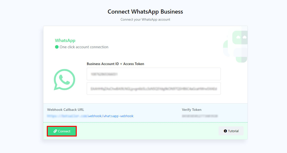 بعد إدخال معرف حساب WhatsApp التجاري ورمز الوصول، انقر فوق زر الاتصال.