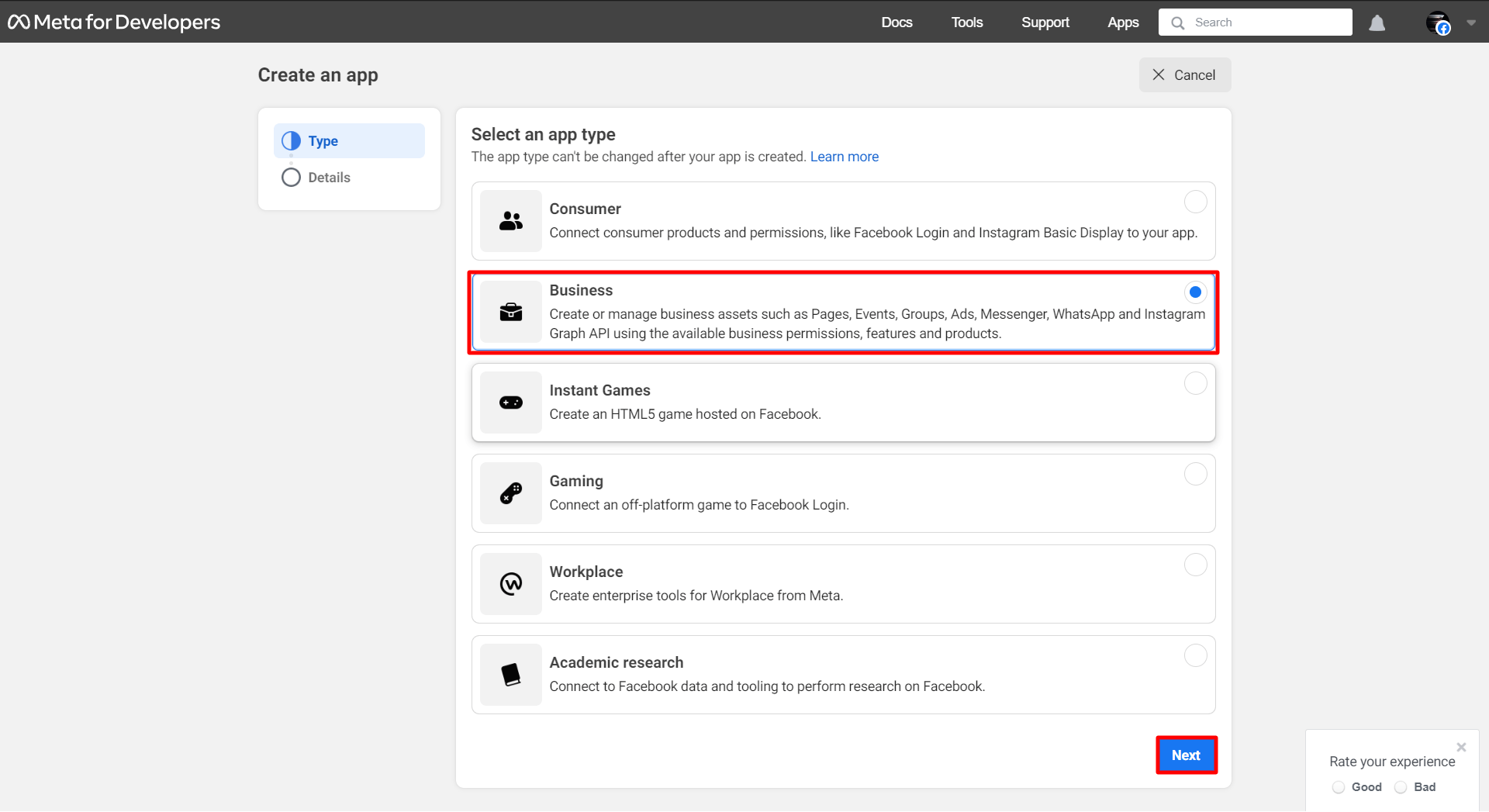ستظهر فورًا صفحة "إنشاء تطبيق" تتضمن قائمة بأنواع التطبيقات. اختر نوعًا من القائمة. اختر "أعمال" كنوع تطبيقك. ثم انقر على زر "التالي".