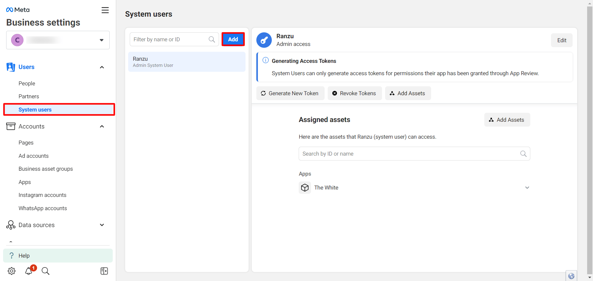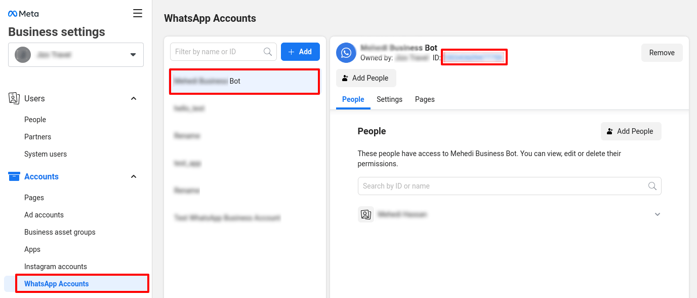 للحصول على مُعرِّف حساب واتساب للأعمال، انتقل إلى صفحة إعدادات الأعمال. ثم في الشريط الجانبي الأيسر، اختر قائمة حسابات واتساب. سيظهر لك قسم حسابات واتساب فورًا. الآن، اختر تطبيقك وانسخ مُعرِّف حساب واتساب للأعمال.