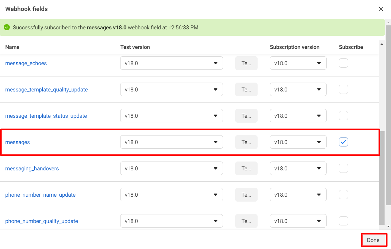 ستظهر نافذة منبثقة تحتوي على حقول خطاف ويب. الآن، اشترك في حقل خطاف ويب الرسائل. انقر على زر "تم".