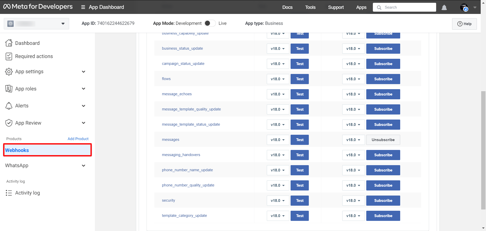 يمكنك أيضًا الاشتراك في خطافات الويب وإلغاء الاشتراك فيها من صفحة خطافات الويب. انقر على قائمة خطافات الويب وستظهر لك صفحة خطافات الويب مع بعض حقول خطافات الويب. في هذه الصفحة، يمكنك الاشتراك في أي حقل خطاف ويب وإلغاء الاشتراك فيه.